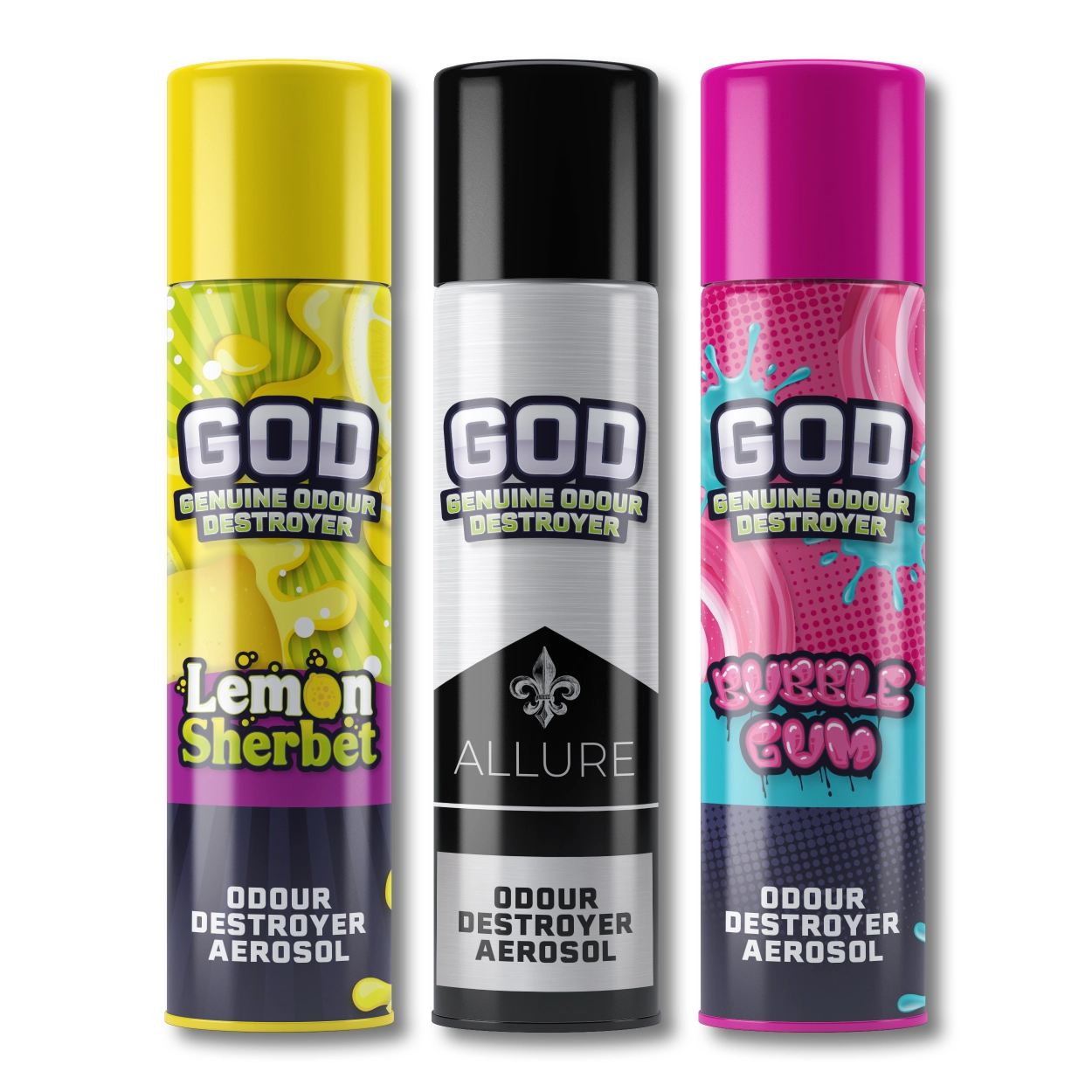 GOD Blast Aerosol is an extra-strong, fast-acting UK-made odour destroyer available in three fragrances: Bubble Gum, Lemon Sherbet and Allure. Instantly eliminates unwanted smells.
